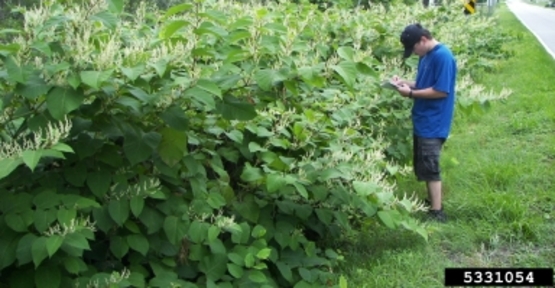 Japanese knotweed (Polygonum cuspidatum Sieb. & Zucc.), a member of the buckwheat family, was introduced into the U.S. from Eastern Asia in the late-1800s. By the late-1930s, it was viewed as a problematic pest. The plant, which can grow from three to 15 feet tall, has bamboo-like stems and is sometimes called Japanese bamboo. As with many invasive plants, knotweed thrives in disturbed areas and once established can spread rapidly, creating monoculture stands that threaten native plant communities (from The NY Invasive Species Clearing House).